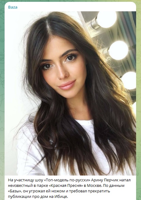 На участницу шоу "Топ-модель по-русски" Арину Перчик напал неизвестный в парке "Красная Пресня" в Москве. Он угрожал ножом и требовал, чтобы она больше не упоминала в СМИ про дом на Ибице.
