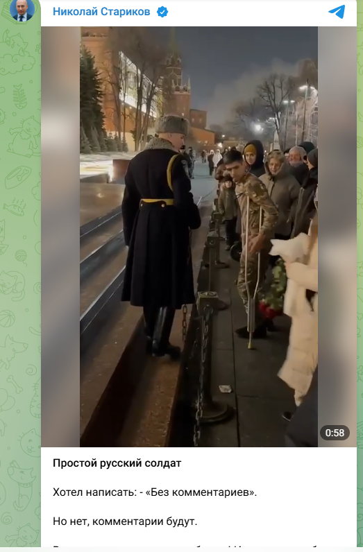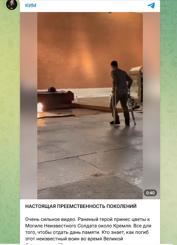 Ранее в интернете широко обсуждался ролик, где российский солдат с хромотой возлагает букет цветов к Могиле Неизвестного Солдата у Кремля. Боец с костылями подошёл к мемориалу и положил цветы. Один из часовых, увидев это, покинул свой пост, чтобы оказать помощь мужчине. Дело в том, что в момент возложения цветов воин хотел опуститься на колено, но при этом потерял равновесие и, пошатнувшись, едва не упал.