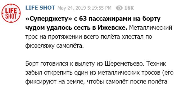 Телеграм-канал Life Shot распространил подробности инцидента с лайнером "Сухой Суперджет-100" "Аэрофлота". Как утверждается, самолёт чудом приземлился в Ижевске, получив более 30 пробоин фюзеляжа.