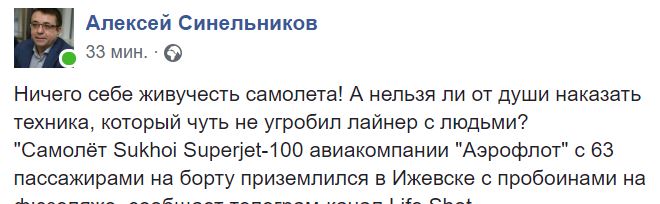 "Ничего себе живучесть самолета!" - восхитился творением отечественного авиапрома журналист Алексей Синельников на своей странице в фейсбуке.