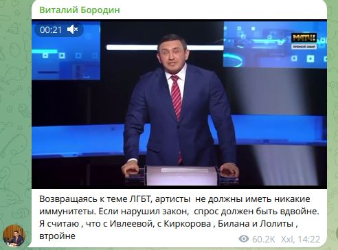 "Возвращаясь к теме ЛГБТ*, артисты не должны иметь никакие иммунитеты. Если нарушил закон, спрос должен быть вдвойне, - написал Бородин в телеграм-канале. - Я считаю, что с Ивлеевой, с Киркорова, Билана и Лолиты - втройне".