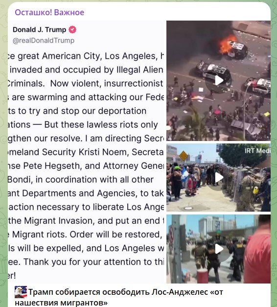 Вслед за этим Трамп поручил министрам внутренней безопасности и обороны, а также генпрокурору Пэм Бонди принять все необходимые меры для устранения беспорядков.