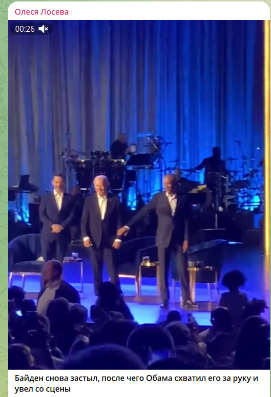 На сцене в Лос-Анджелесе оба президента США - нынешний и бывший - прощаются с публикой. Но ведут себя по-разному: Обама машет рукой, а Байден неподвижно застыл. В какой-то момент бывший понял, что происходит неладное, и, взяв за руку действующего лидера, повел со сцены,