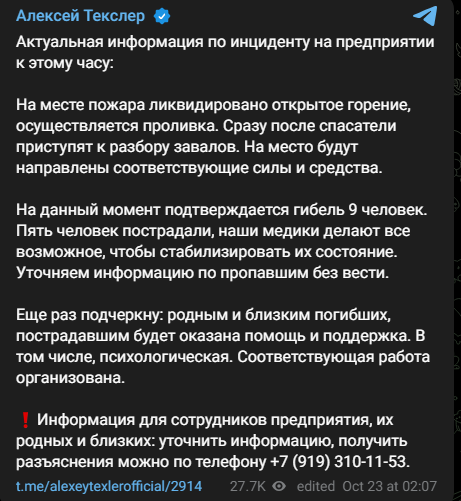 По состоянию на 07:30 23 октября подтверждена гибель уже девяти человек, за жизни ещё пяти человек сражаются медики. "Уточняем информацию по пропавшим без вести", добавил Текслер.