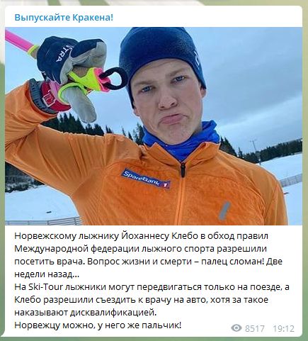 Саркастический комментарий появился в Telegram-канале "Выпускайте Кракена!". Лыжная гонка Ski-Tour длится много дней, и по её правилам, разработанным международной федерацией данного вида спорта (FIS), участники между точками соревнований должны перемещаться исключительно на поездах. Но для Йоханнеса Клебо было сделано исключение.