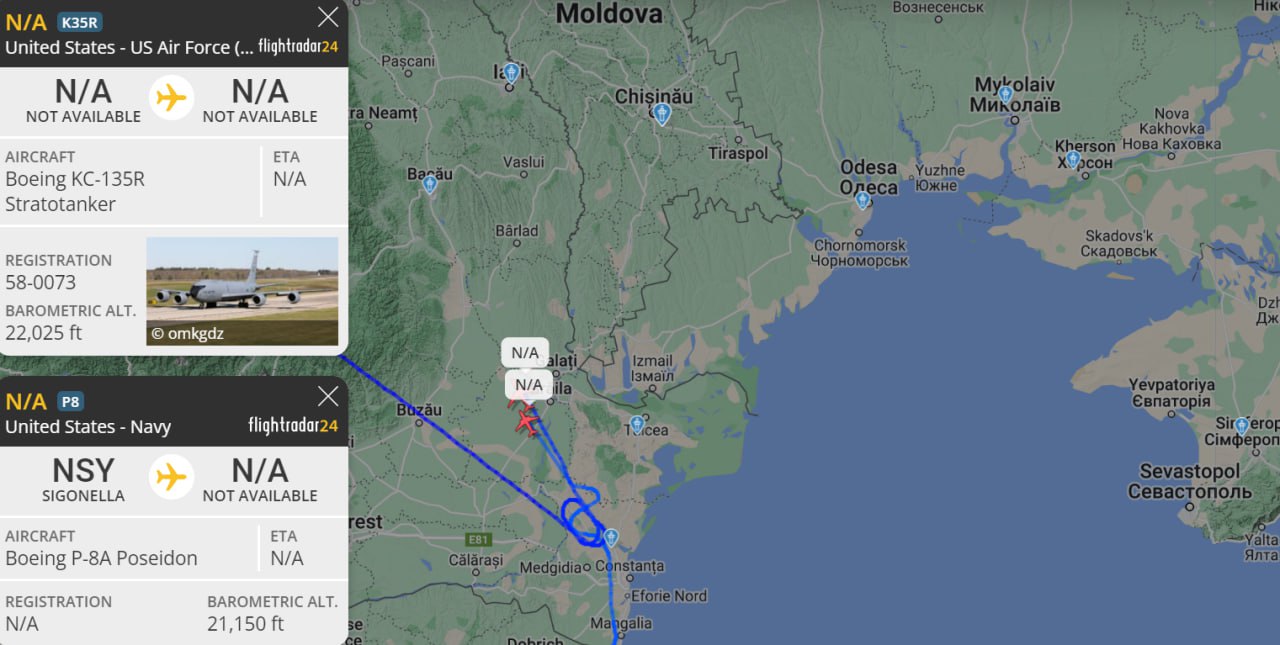Сообщается, что разведывательный самолёт США кружит в небе над Румынией в компании летающего танкера Boeing KC-135R Stratotanker, который осуществляет дозаправку воздушного шпиона. Как только процесс будет завершён, машина приступит к выполнению задачи по радиоэлектронной разведке на территории русского полуострова.