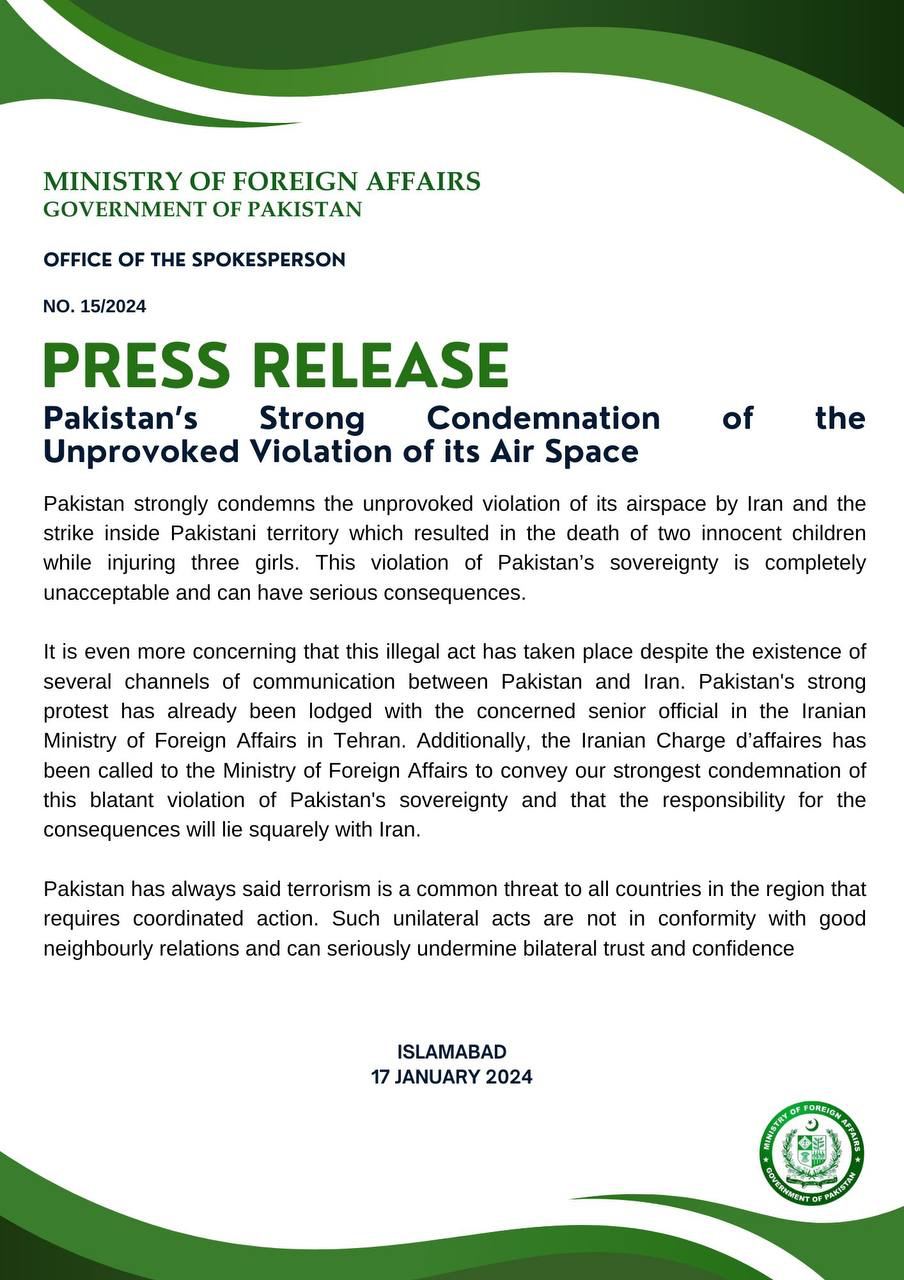 Также Пакистан сообщил, что случайными жертвами воздушного удара со стороны Ирана стали дети. Два ребёнка погибли, и ещё три девочки получили ранения различной степени тяжести.