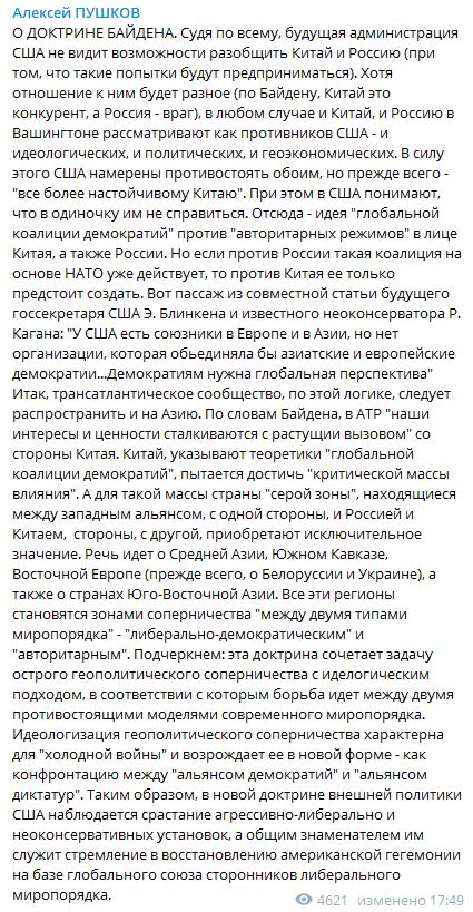 Пушков также вспомнил слова Байдена о необходимости распространения американского влияния на "серую зону" - пространство, которое находится между Западом с одной стороны и Россией с Китаем - с другой. Под "серой зоной" подразумевается вся Средняя Азия, Юго-Восточная Азия, Южный Кавказ и Восточная Европа (в особенности - Украина и Белоруссия).