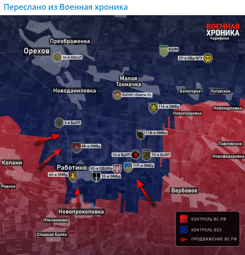 В настоящее время в посёлке идут активные бои. Русские военные уже зашли на западную окраину Работино. Наступление идёт сразу с четырёх направлений. По последним данным, "ореховские спартанцы" из 42-й дивизии продвинулись к застройке, заняв ряд домов и оттеснив неприятеля. Враг активно использует артиллерию и дроны, но русские отвечают тем же - накрывая позиции противника плотным огнём.