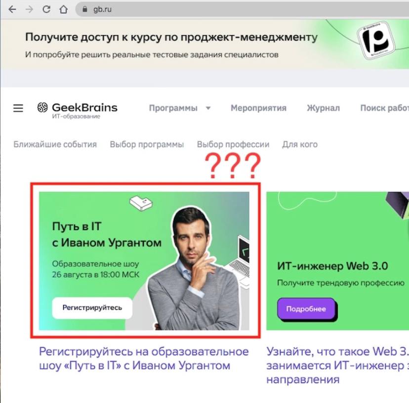 Рекламный баннер с телеведущим заметили на портале московского образовательного центра GeekBrains. В объявлении предлагается зарегистрироваться на участие в "образовательном шоу" с участием Ивана Урганта. Мероприятие назначено на 26 августа.
