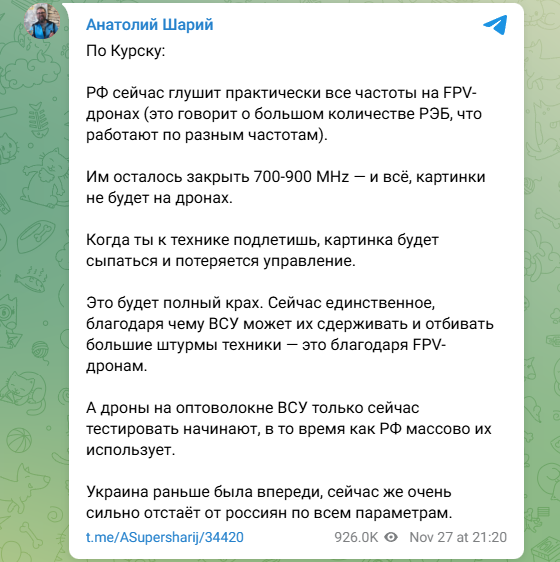 По данным блогера, русским удалось заглушить почти все частоты, на которых работают FPV-дроны.