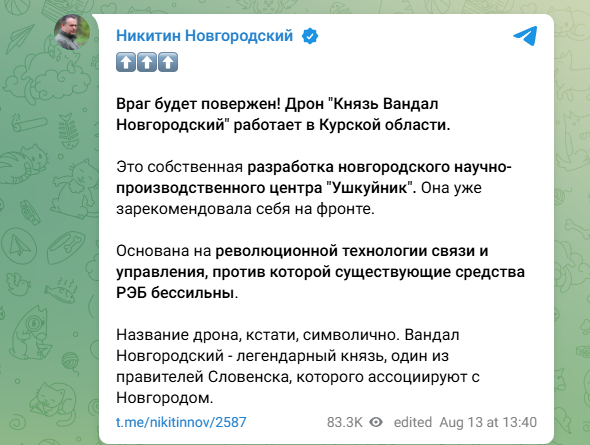 Враг будет повержен! Дрон "Князь Вандал Новгородский" работает в Курской области… Название дрона, кстати, символично. Вандал Новгородский - легендарный князь, один из правителей Словенска, которого ассоциируют с Новгородом,