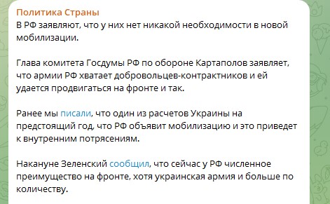 После очередной такой попытки долго им пришлось ждать и вот дождались. А чего именно? Да попросту слова "мобилизационный", сказанного из уст представителя власти. И тут, как говорится, понеслась: например, Telegram-канал "ЕЖ"* несколько раз публиковал комментарии на этот счёт, с едкой иронией назвав Алексея Журавлёва "неосторожным". Некоторые другие ресурсы и вовсе не стали вдаваться в подробности и запестрели заголовками: "Россиян призвали готовиться к мобилизации", "Жителям России сообщили о будущей мобилизации", "В России готовят новую волну мобилизации" и прочее. В свою очередь украинский ресурс "Страна" пишет прямо: "Один из расчётов Украины на предстоящий год, что РФ объявит мобилизацию и это приведёт к внутренним потрясениям".
