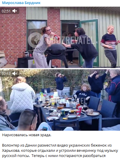 Волонтёр из Дании снял на видео, как проводят досуг беженки из Харькова. Они устроили вечеринку с застольем, во время которой начали плясать под русские хиты поп-музыки 1990-х. В частности, можно услышать песню "Бухгалтер" Алёны Апиной.
