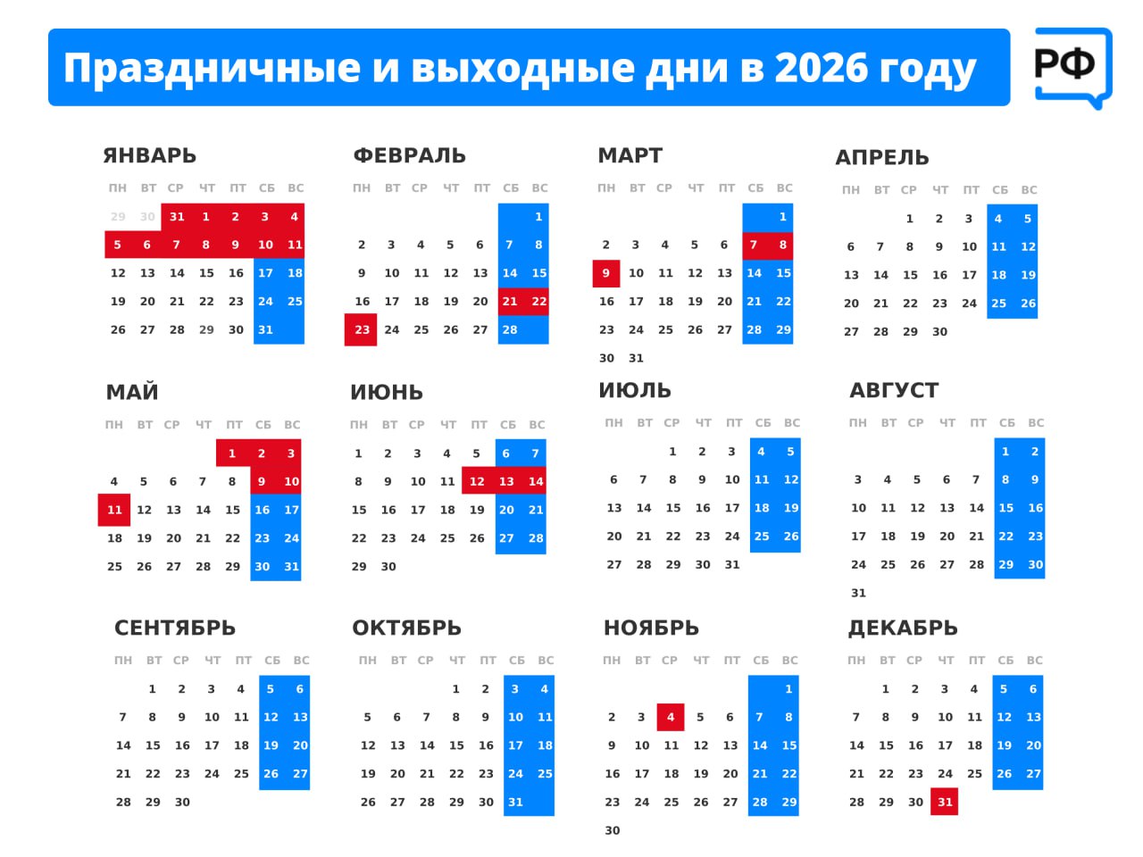 Ожидается, что граждане начнут отдыхать 31 декабря 2026 года и выйдут на работу не ранее 11 января 2027 года.
