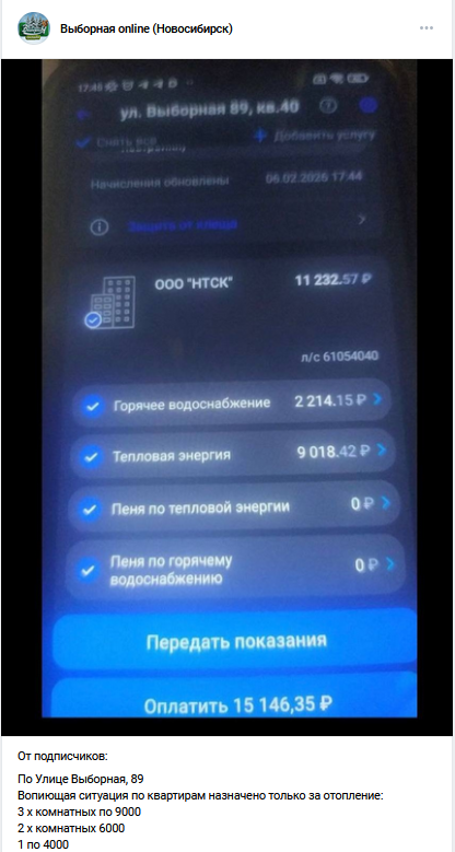 В "Сибирской генерирующей компании" пояснили: причина не в росте тарифа, а в ежегодной корректировке. Дом оснащён общедомовым счётчиком тепла, который исправен и опломбирован. Весь 2025 год жители платили по среднемесячным показаниям за 2024-й. В январе 2026-го бухгалтерия пересчитала фактически съеденные гигакалории за минувшие 12 месяцев. Поскольку прошлой зимой и в начале этой город пережил несколько морозных периодов, общедомовой прибор накрутил больше обычного. Разницу теперь раскидали на квадратные метры.