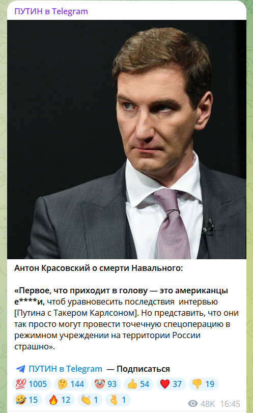 Телеграм-канал "ПУТИН в Telegram" распространяет более эмоциональное заявление Красовского о смерти Навального: