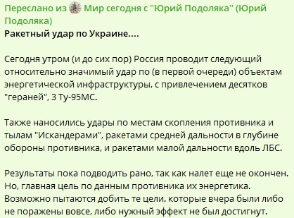 Сегодня утром (и до сих пор) Россия проводит следующий относительно значимый удар по (в первой очереди) объектам энергетической инфраструктуры с привлечением десятков "Гераней", 3 Ту-95МС,