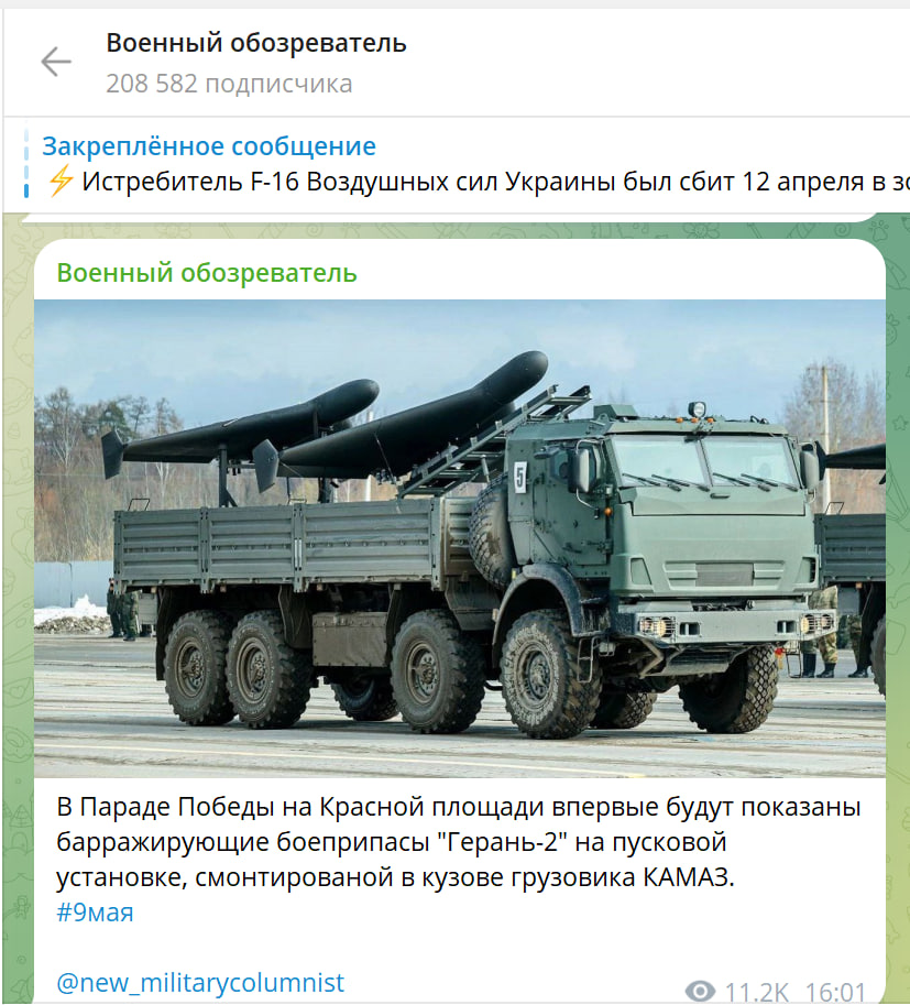 9 мая на Параде Победы будут представлены новые русские снаряды, пишет телеграм-канал "Военный обозреватель". На Красной площади будет представлен барражирующий снаряд "Герань-2".
