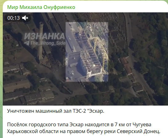 Военэксперт Михаил Онуфриенко сообщил, что на Харьковщине в пгт Эсхар в 7 км от Чугуева был уничтожен машинный зал ТЭС-2 Эсхар.
