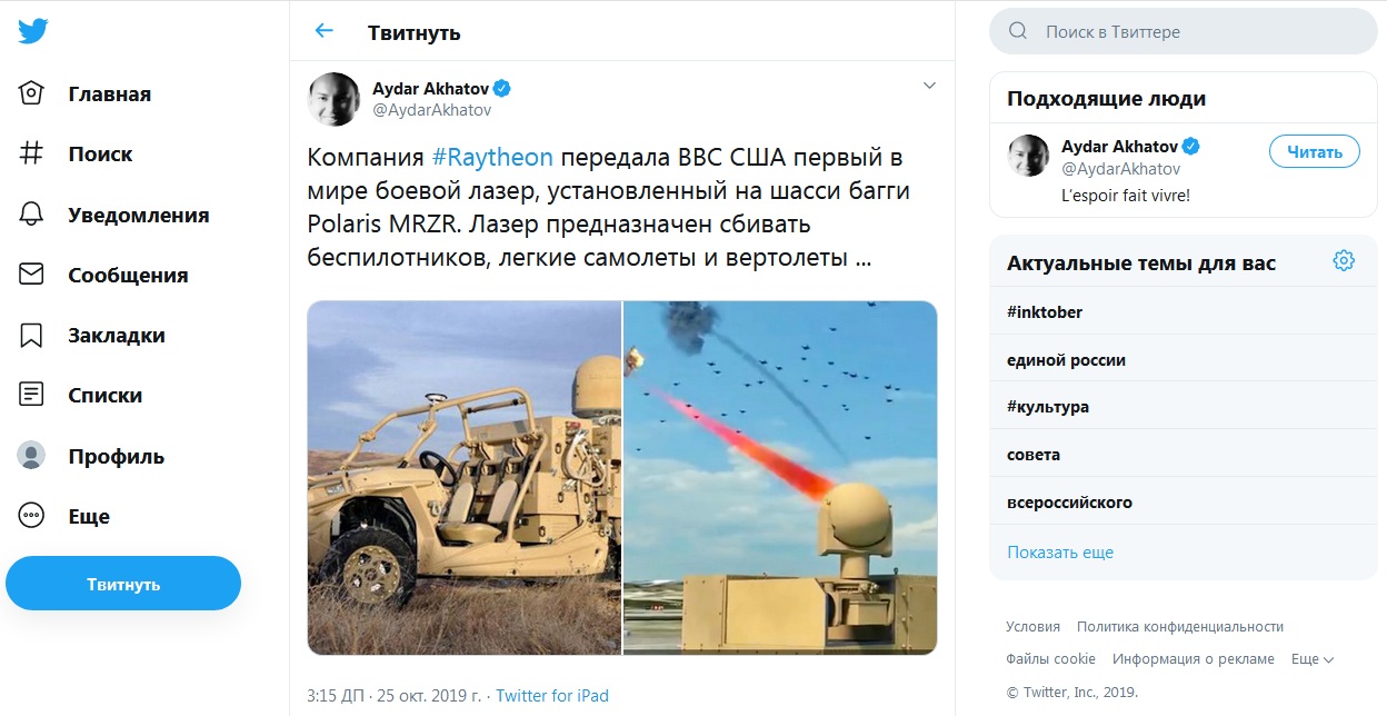 Единственное применение данной установки, которое видит эксперт, - эта защита относительно небольших военных подразделений от лёгких разведывательных беспилотников с небольшим радиусом действия. Учитывая, что у США самый большой в мире военный бюджет, они, в принципе, могут позволить себе траты на подобные установки. Эффективно ли тратить деньги на подобные установки - это уже другой вопрос, отмечает Коротченко.