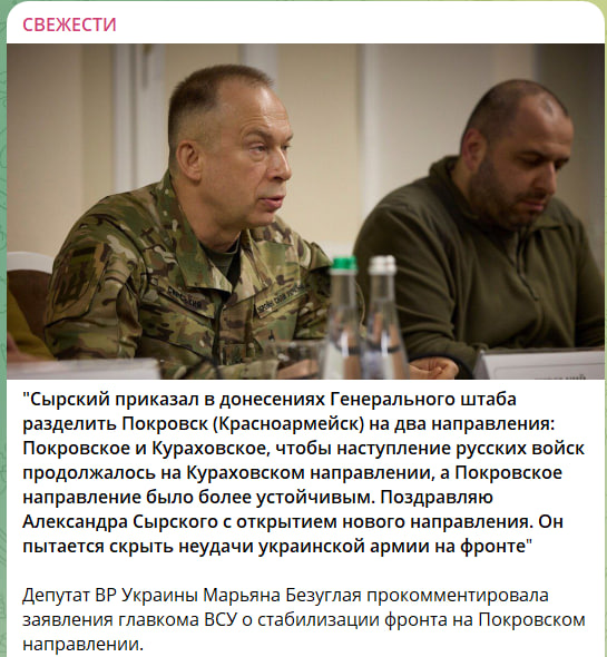 Сырский приказал в донесениях ГШ разделить Покровск (Красноармейск) на два направления: Покровское и Курахское, чтобы наступление русских войск продолжалось на Кураховском направлении, а Покровское направление было более устойчивым. Поздравляю Александра Сырского с открытием нового направления. Он пытается скрыть неудачи украинской армии на фронте.