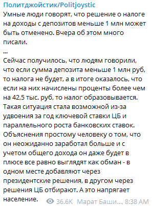 Баширов отметил, что это решение можно трактовать как обман. Людям обещали, что они будут больше зарабатывать из-за роста ключевой ставки, но в то же время у них стали больше забирать.