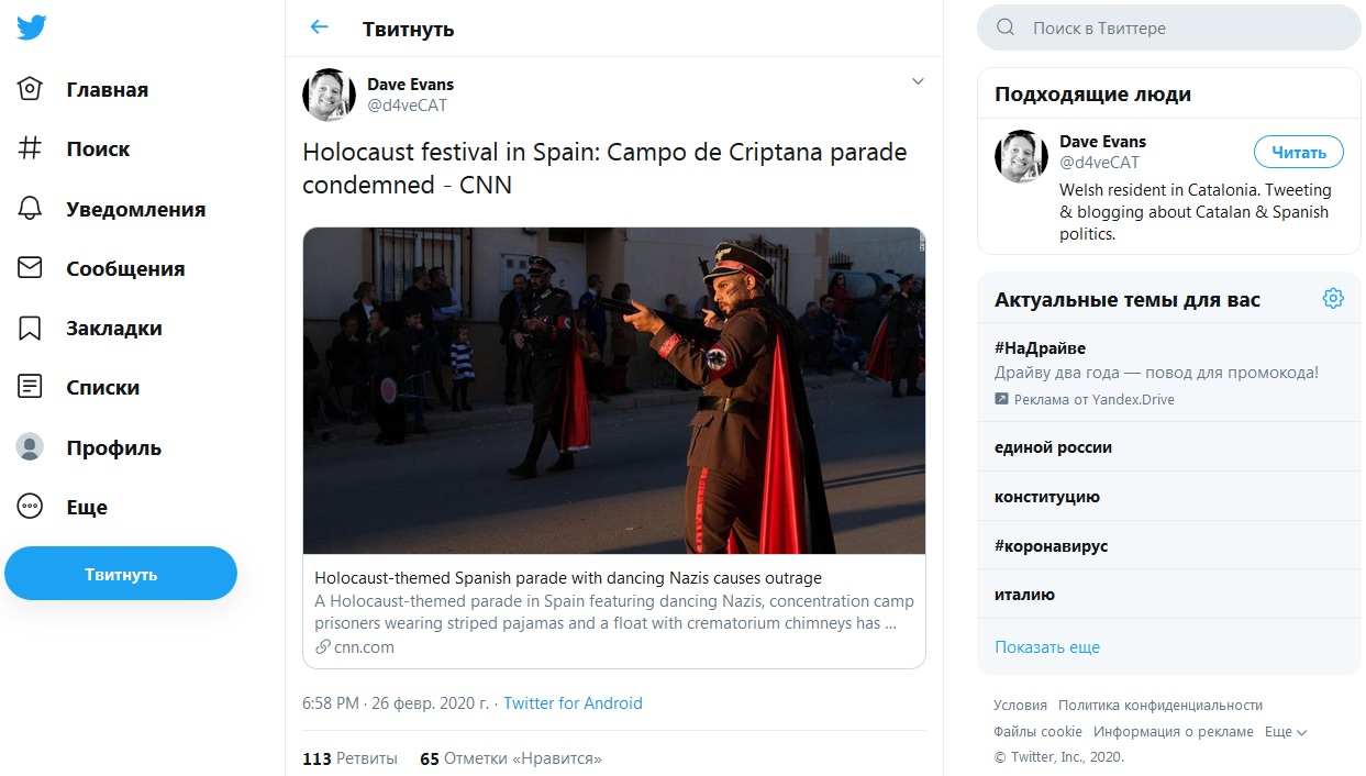 У меня шок. Ну твари просто. Не могут дождаться, когда последние жертвы нацизма не смогут стать свидетелями разгула креатива этих толерантных либерастов? Посольство Израиля возмущено элементом карнавала в Кампо-де-Криптана. А ведь это уже открытая пропаганда нацизма. Это нивелирование и оскорбление жертв нацизма, - комментирует в своём Telegram-канале писатель, публицист и ведущий программы "Еврозона" Владимир Сергиенко.