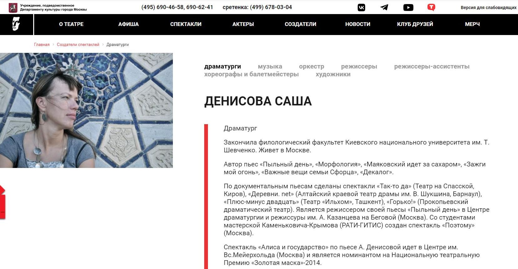 Информация устарела - Денисова давно уже не "живёт в Москве". Скриншот: интернет-сайт mayakovsky.ru