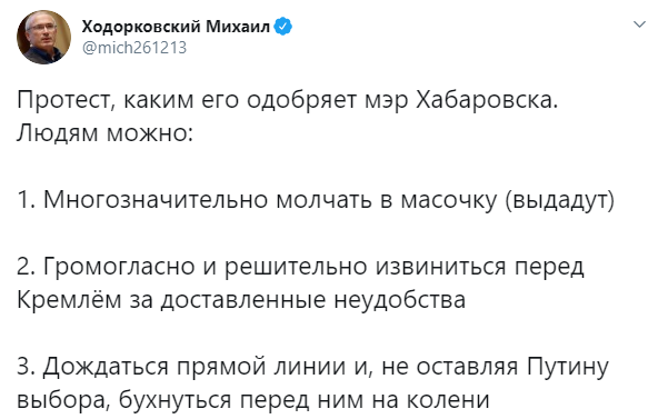 В своём Twitter-аккаунте Ходорковский вместо объяснений по поводу громких обвинений сотрудников его организаций в насилии, "топит" за идею массовых протестов в Хабаровске.