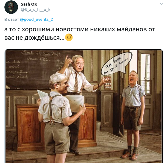 "А то с хорошими новостями никаких майданов от вас не дождёшься…" - иронизирует Sash OK @S_a_s_h__o_k, опубликовав шутливый коллаж с блогером-оппозиционером Алексеем Навальным, беглым бизнесменом Михаилом Ходорковским и американским финансистом Джорджем Соросом. При этом российские оппозиционеры изображены в роли учеников, а американец - в роли учителя.