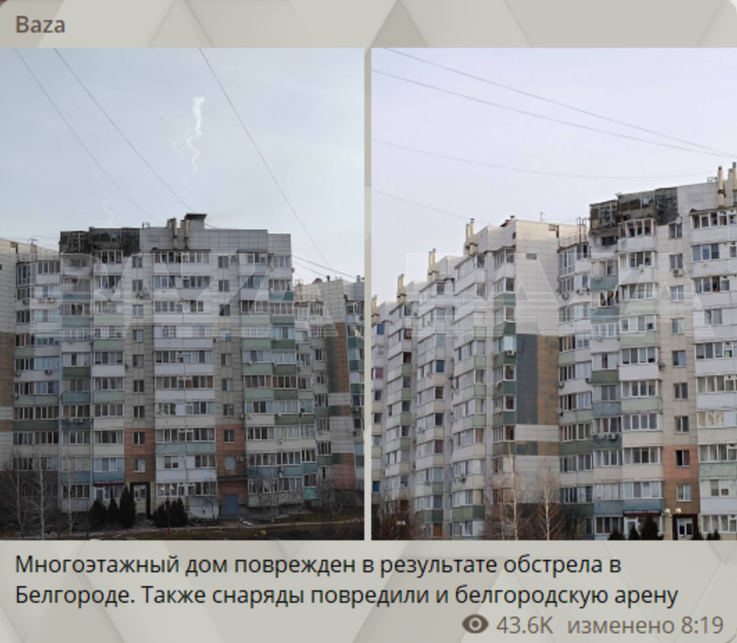 Тем временем уже утром на Белгород была совершена очередная атака. В результате обстрела повреждён многоэтажный дом: удары пришлись по верхним этажам. Также снаряды повредили и "Белгород-Арену".