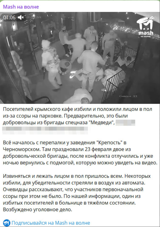 На гостей крымского кафе "Крепость" напали некие военнослужащие прямо парковке заведения. Впоследствии стало известно, что нападавшими оказались добровольцы из бригады спецназа "Медведи" ВС РФ. Источник опубликовал неожиданные подробности, благодаря чему стало известно, что заставило русских бойцов пойти с автоматами на мирных граждан прямо в День защитника Отечества.