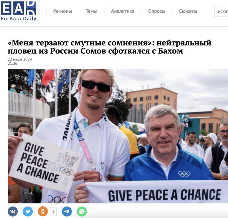 Русский пловец Сомов, выступающий на Олимпиаде под нейтральным флагом, был замечен на антивоенном митинге с Томасом Бахом. "Дайте миру шанс" - гласит надпись на его плакате. "Обратно в Россию припрётся?" - задался вопросом военкор Стешин, узнав детали.