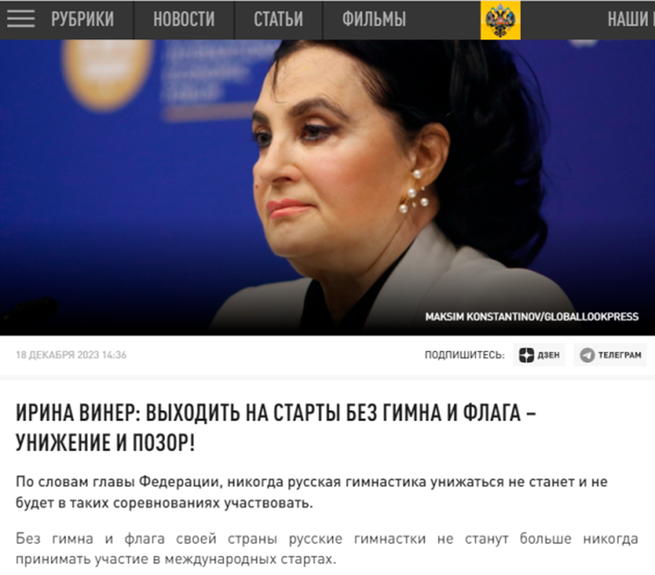 ИРИНА ВИНЕР: ВЫХОДИТЬ НА СТАРТЫ БЕЗ ГИМНА И ФЛАГА - УНИЖЕНИЕ И ПОЗОР! СКРИНШОТ: САЙТ ЦАРЬГРАДА