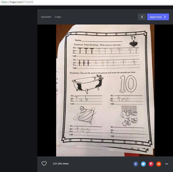 Пользователей Сети завела в тупик одна задачка, которую разместила в интернете мама 5-летней девочки из Нью-Йорка. Дети изучали алфавит, и в этот день им досталась буква Т. На дом они получили листок, где на четырех картинках были изображены слова, начинающиемся на эту букву.