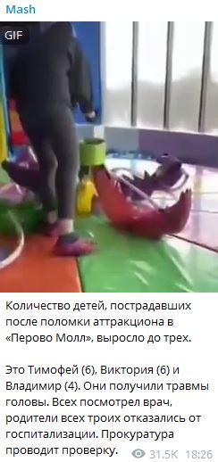 В воскресенье в детской зоне торгового центра, расположенного в московском районе Перово, произошёл обрыв аттракциона. Сперва сообщалось об одном пострадавшем ребёнке, однако, по уточнённой информации, травмы получили как минимум трое детей - два мальчика в возрасте 6 и 4 лет, а также 6-летняя девочка. Об этом сообщает Telegram-канал Mash.