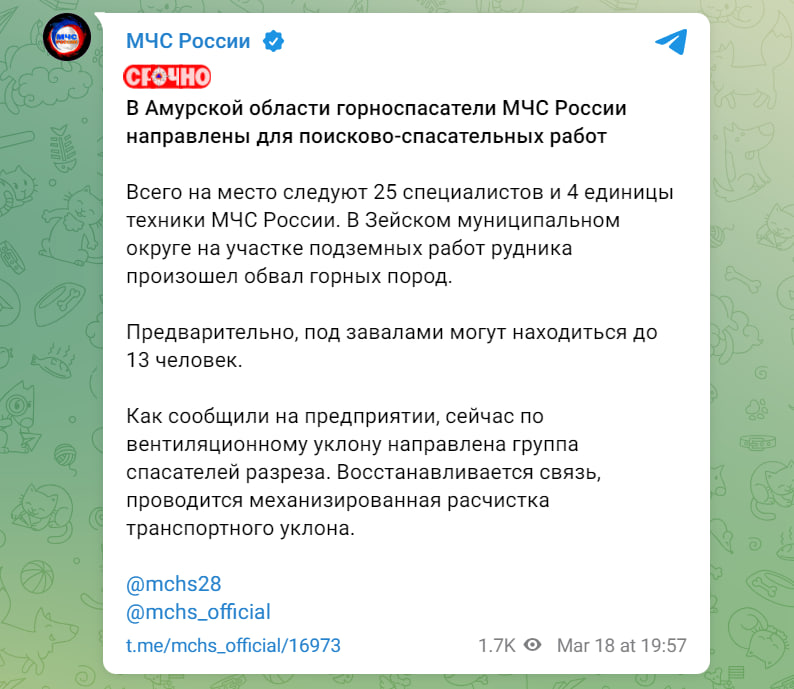 Во время подземных работ на руднике "Пионер" в Зейском муниципальном округе Амурской области произошёл обвал. С группой горняков, находившихся в забое, пропала связь.