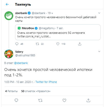 Тем самым банк отреагировал на креатив другой компании, сотового оператора "МегаФон", в аккаунте которого было написано: "Очень хочется простого человеческого 5G-интернета".