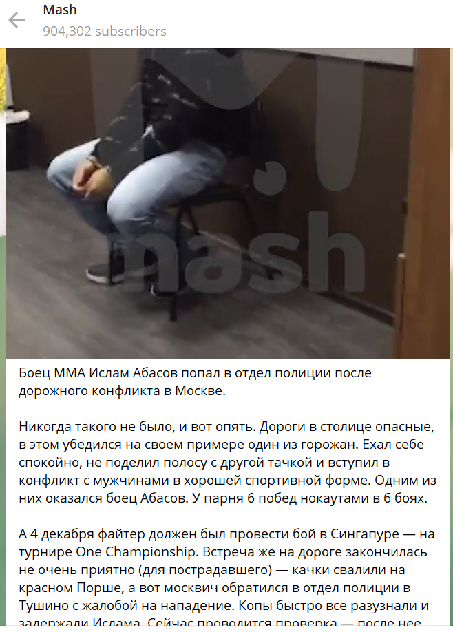 Бой MMA с участием представителя РФ Ислама Абасова, назначенный на 4 декабря, отменён. Спортсмен был задержан вечером 24 ноября столичной полицией после дорожного происшествия на одной из улиц Москвы.