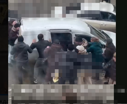 Неравнодушные горожане освобождают жертву "людоловов". Вскоре после этого ТЦКшники сбегут, оставив машину. Скриншот: Телеграм-канал "Кирилл Фёдоров / Война История Оружие"