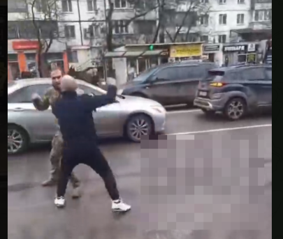 Одессит бьёт сотрудника ТЦК прямо в голову. Тот сперва испугается и отбежит, но затем пустится в погоню. Скриншот: Телеграм-канал "Кирилл Фёдоров / Война История Оружие"