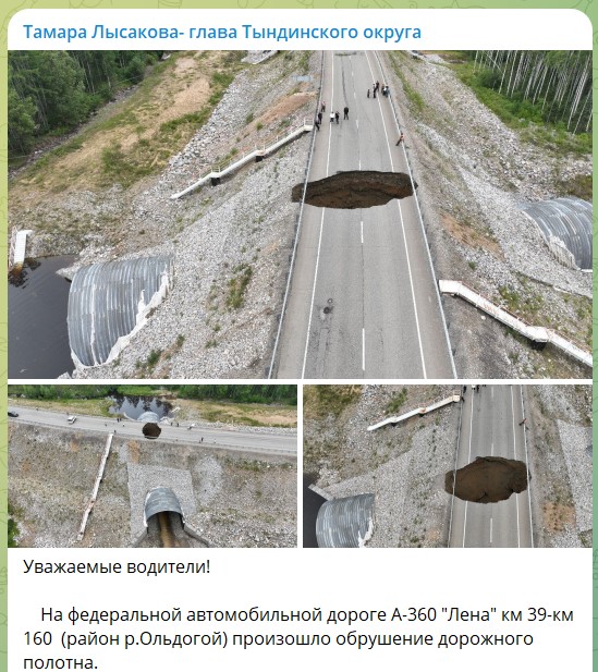 "На федеральной автомобильной дороге А-360 "Лена" км 39-км 160 (район р.Ольдогой) произошло обрушение дорожного полотна, - рассказала в своём телеграм-канале глава Тындинского округа Тамара Лысакова. - Движение по автодороге закрыто. В округе введён режим ЧС".