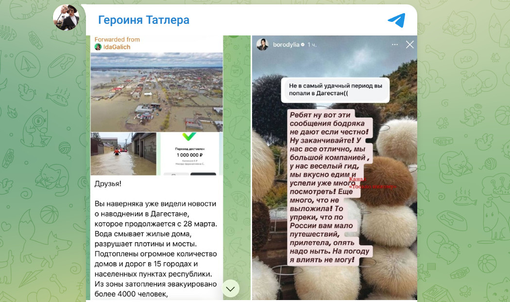 Одна трагедия – два скриншота. Первый – из Telegram-канала телеведущей, певицы, блогера Иды Галич. Она опубликовала фотографии, демонстрирующие масштаб трагедии в Дагестане – улицы, где воды почти по пояс, затопленные посёлки. И рядом скриншот о перечислении денег на помощь пострадавшим в зоне бедствия.