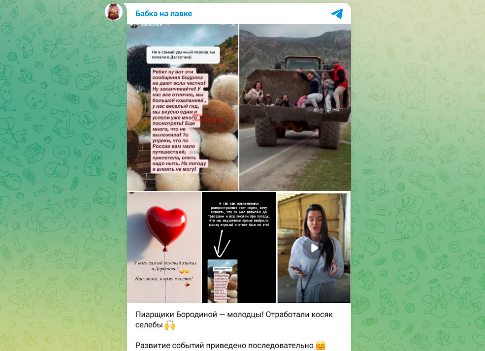 Конечно, в соцсетях тут же поднялась волна негодования. Но явно подключились пиарщики Ксюши и принялись усиленно отрабатывать промашку начальницы. Появились оправдания за первый из "отчётов" о поездке: мол, текст был написан до трагедии и вообще речь шла про погоду. Растиражирован момент, где Бородина отвечает на комментарии подписчиков по поводу погоды – якобы апрель не самый удачный месяц для путешествия в Дагестан.