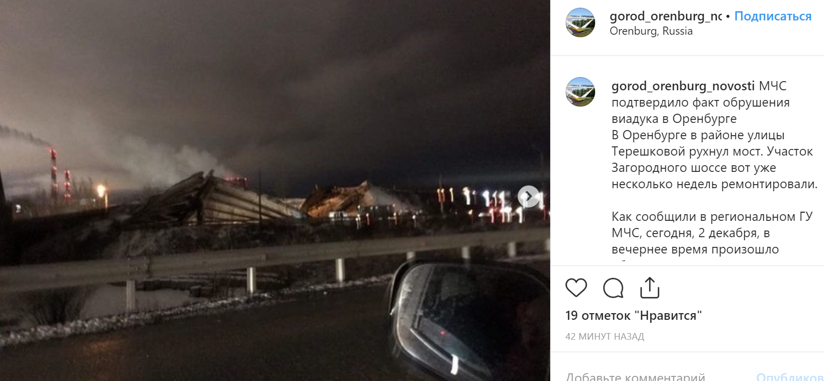 19.37 Очевидцы рассказали, что обрушению моста на выезде из Оренбурга предшествовало тревожное сообщение об аварии, произошедшей за несколько часов до происшествия под виадуком. На участке оборвались провода.