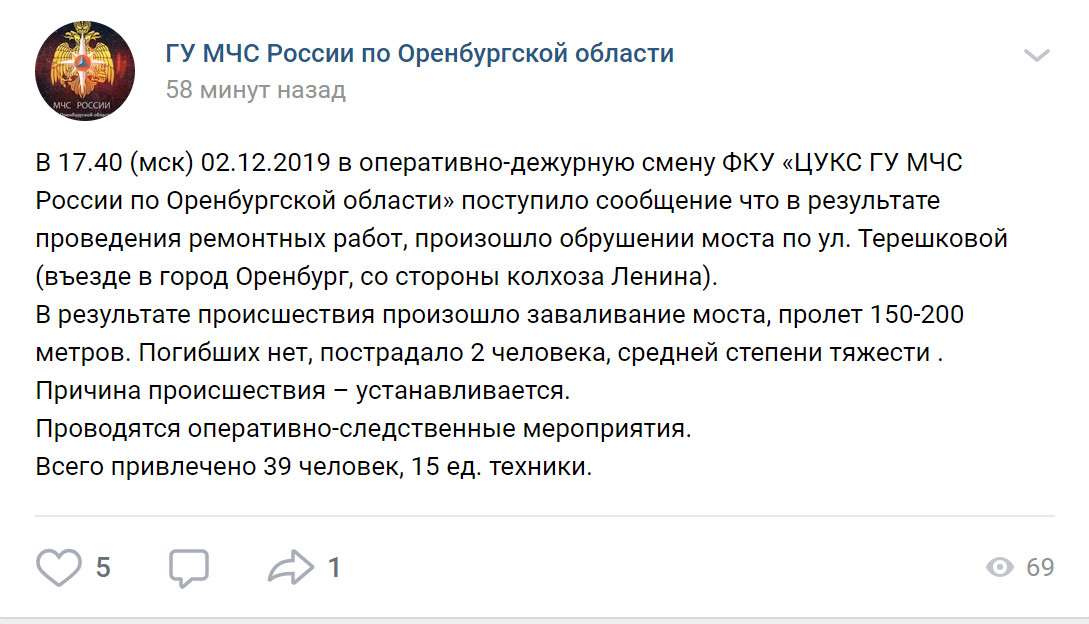 19.44 В региональном управлении МЧС прояснили детали ЧП. Как отметили в ведомстве, произошло заваливание моста на въезде в Оренбург. Жертв нет, хотя в соцсетях уже появились вбросы о погибших. Спасатели подчёркивают: пострадали два человека.