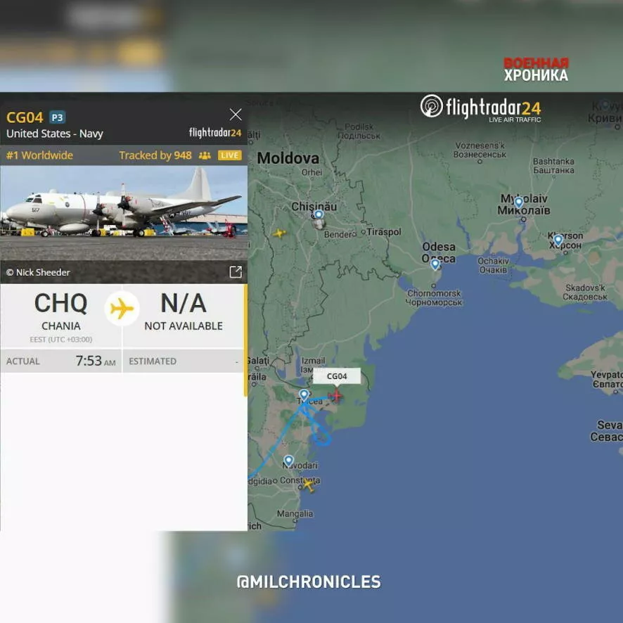 После ночных прилётов по украинским портам был замечен самолёт-разведчик ВМС США. Скриншот: flightradar24