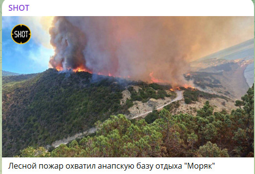 По данным SHOT, лесной пожар также охватил анапскую базу отдыха "Моряк". Там горит уже 11 зданий, включая столовую и несколько хозяйственных построек. Люди эвакуированы.