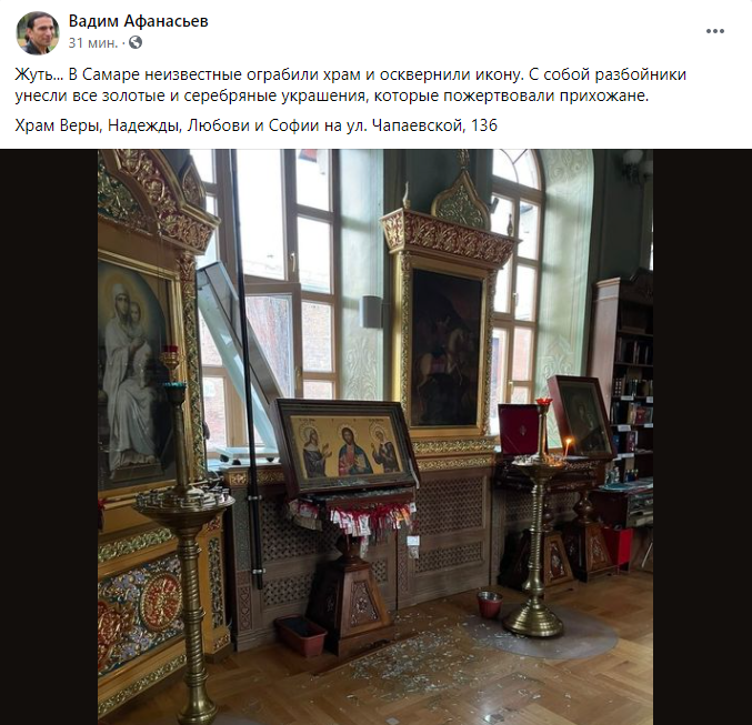 Воры обчистили храм и осквернили икону в храме Веры, Надежды, Любови и Софии на улице Чапаевской в Самаре. Местные жители говорят, что храм примыкает к отделению полиции, но правоохранители не заметили, что происходит что-то неладное. Вся надежда на записи с камер видеонаблюдения: их в том районе немало.